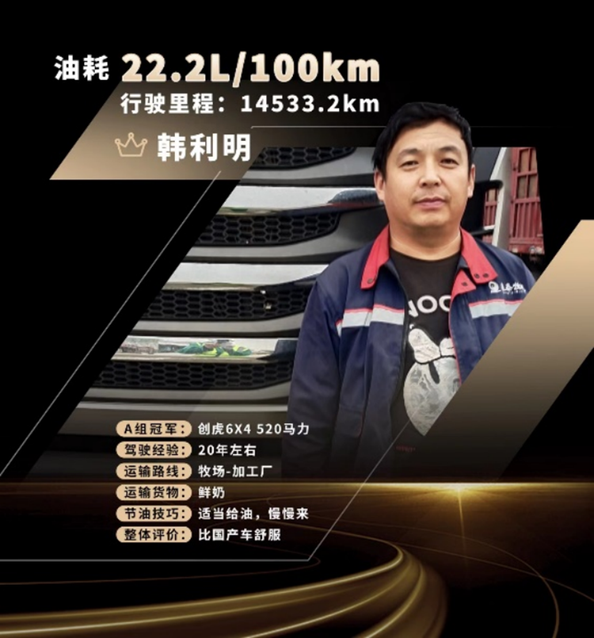 12月19日,历时20天的“高效创虎 油你来战”2022现代商用车创虎大师线上挑战赛迎来岁末收官,在这场高手巅峰对决的舞台上,参赛者各展所长各尽其能,将高超的个人驾驶技能与现代创虎的节油性能发挥到了极致。经过紧张刺激的比拼,现代创虎的油耗被不断刷至新低,最终来自安徽的韩利明以百公里22.2升的油耗,锁定A组(500马力及以上)冠军,而广东的苏创洪则以百公里25.7升的成绩位列B组(500马力以下)第一。