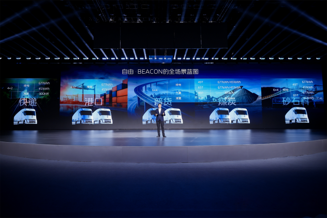 以福田卡文重卡BEACON为例,基于独创的一体化平台,独创跨平台、可拓展、高集成的动力底盘一体化架构,实现氢电共平台与高集成承载。