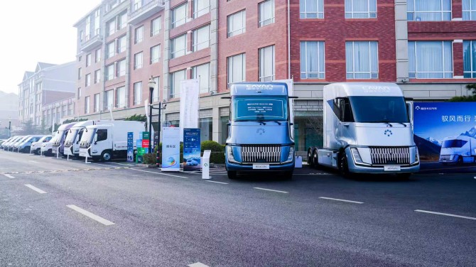 尤其是福田卡文重卡液氢车型,是行业首个将航空航天领域液氢技术,突破性地应用于量产化的新能源重卡。通过62项新材料、新结构、新工艺革新,整车减重30%;自研300kW燃料电池采用高耐久膜电极与长寿命电堆技术,B10寿命可达160万公里,常用工况效率≥58%,效率优于行业水平9个百分点。